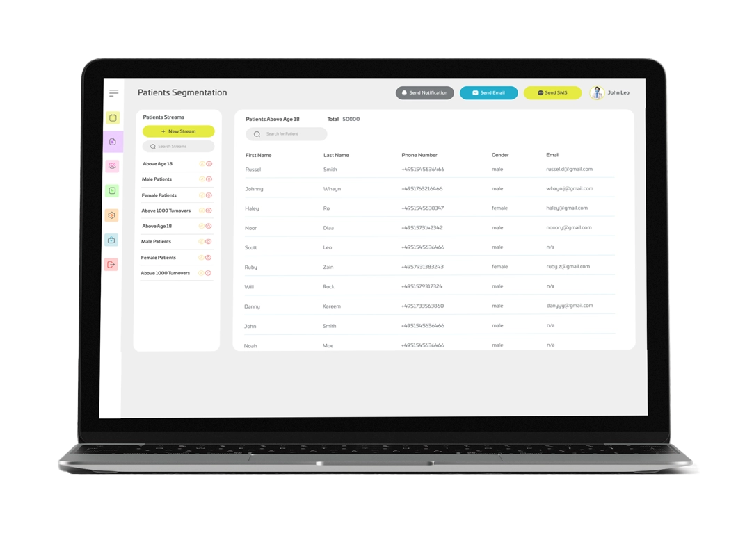 Automated communication with patients through WhatsApp, Email, SMS and push notifications.